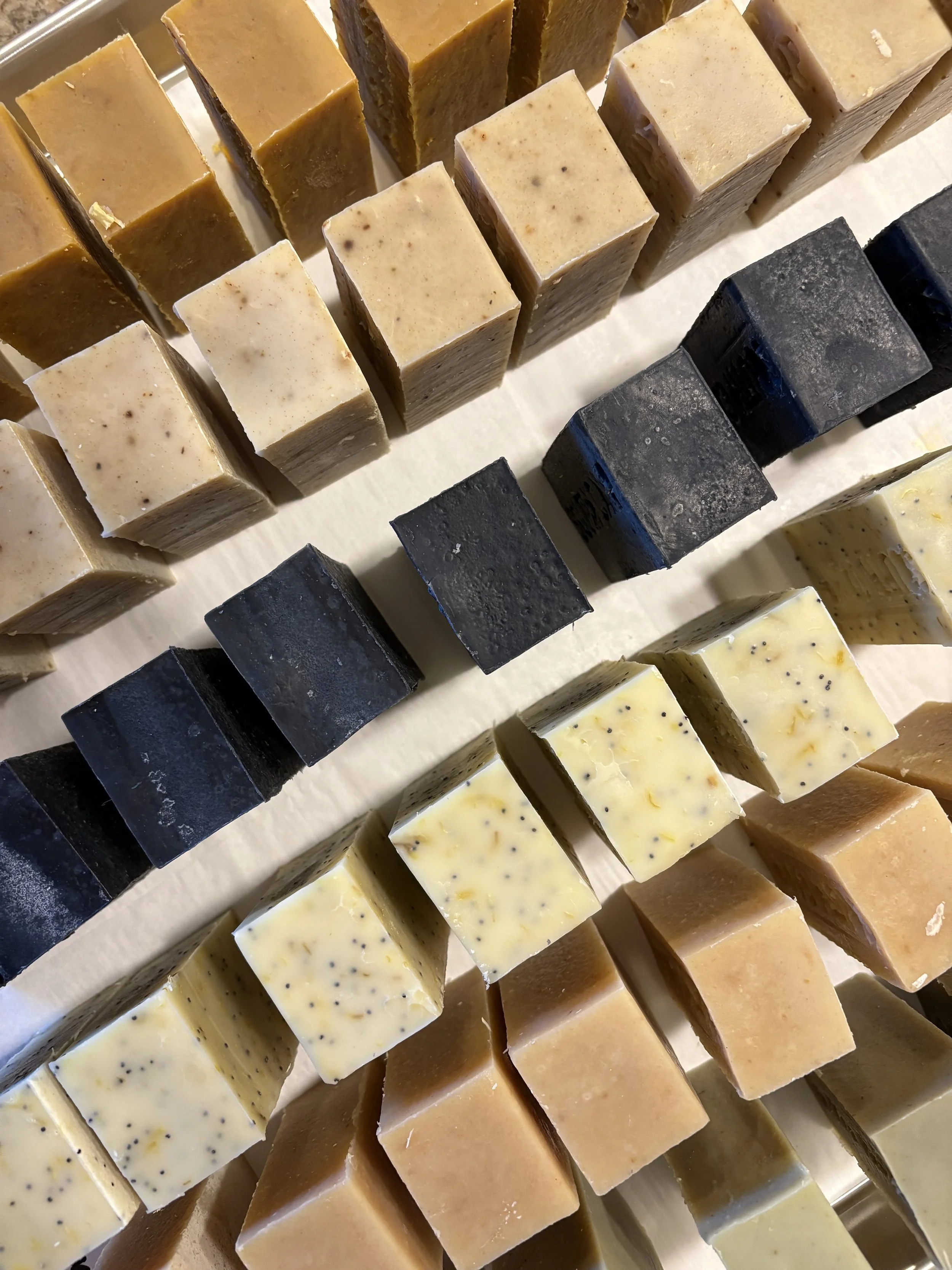 Our soaps are made with all natural, all organic ingredients sourced from reputable suppliers and harvested locally when possible. No synthetics of any kind. Made by hand in small batches.